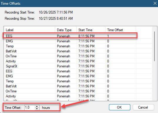 - Adjust the Time Offset (bottom left corner), by appropriately selecting the hours to adjust the time stamp